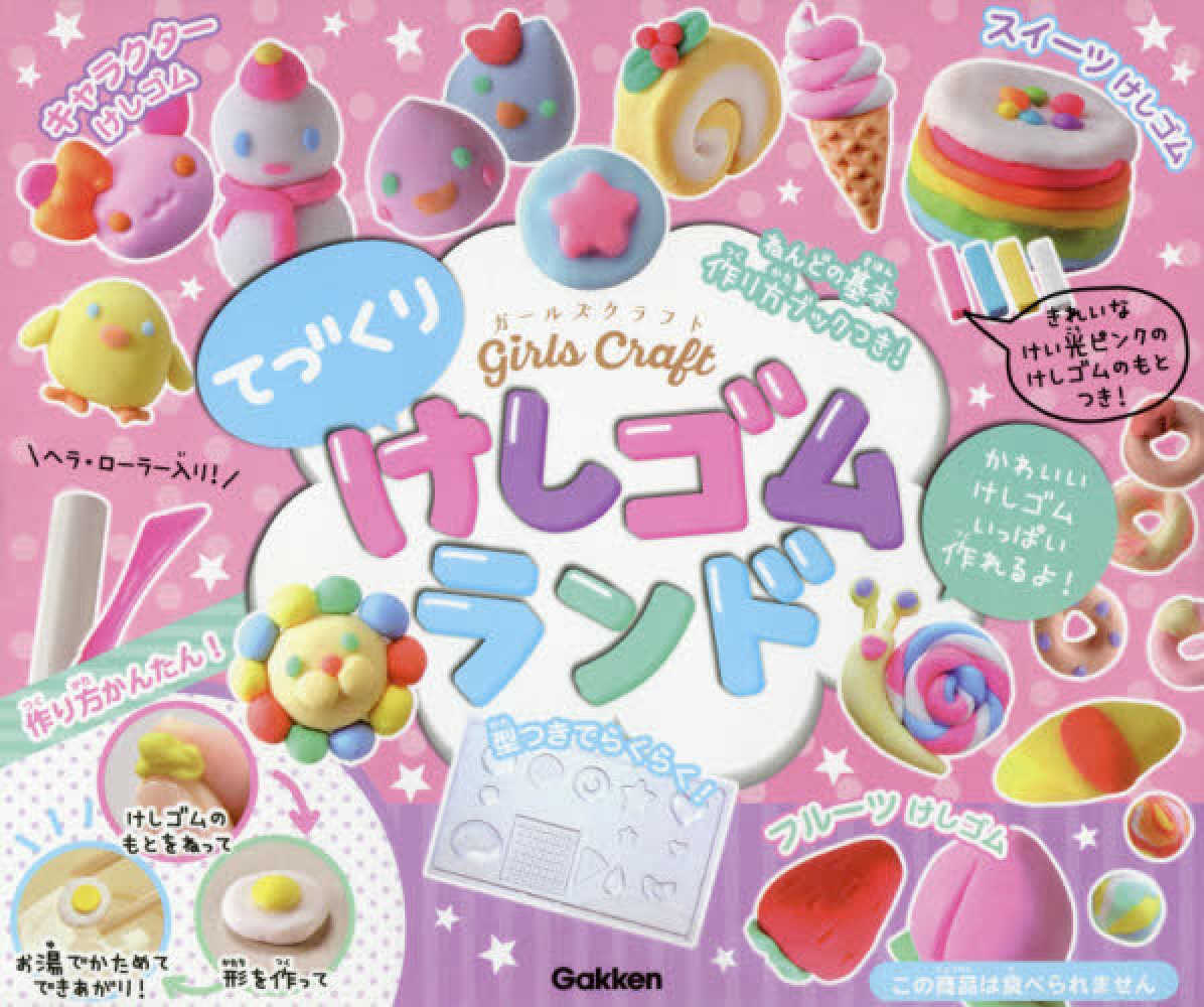 けしごむのもとをねって、かたちを作ってかためれば、あなただけのオリジナルけしゴムがいっぱい作れちゃうよ!スイーツや果物、動物やかわいいキャラクターの作り方がたっぷり載った冊子と、かんたんに作れる型がついてくる。