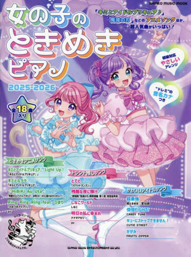 幼児~小学校低学年の女の子におすすめ!やさしいアレンジのピアノ楽譜集ムックが今年も登場します。 『 キミとアイドルプリキュア♪』などのアニメの曲から「かわいいだけじゃだめですか?」などの流行りの曲まで、超人気曲を収載しております。 すべての音に“ドレミ”の音名カナつきで、かんたんに楽しく演奏できます。 とってもかわいい表紙もおすすめポイントです。曲目●【ときめきアニメソング】キミとアイドルプリキュア♪ Light Up!「キミとアイドルプリキュア♪」/キミとルララ「キミとアイドルプリキュア♪」/♪HiBiKi Au Uta♪「映画キミとアイドルプリキュア♪お待たせ!キミに届けるキラッキライブ!」/【トレンド推しソング】残酷な夜に輝け『劇場版「鬼滅の刃」無限城編 第一章 猗窩座再来』/明日の私に幸あれ(ナナオアカリ)/しなこワールド(しなこ)/とてと(パペットスンスン)/【かわいいアイドルソング】かわいいだけじゃだめですか?(CUTIE STREET)/他、全18曲予定