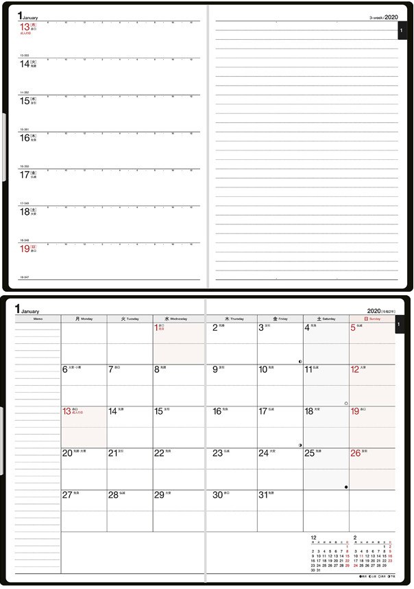 仕様 2:【記入欄】 ●月間予定表…ブロック式 ●週間予定表…レフト式 ●月曜始まり