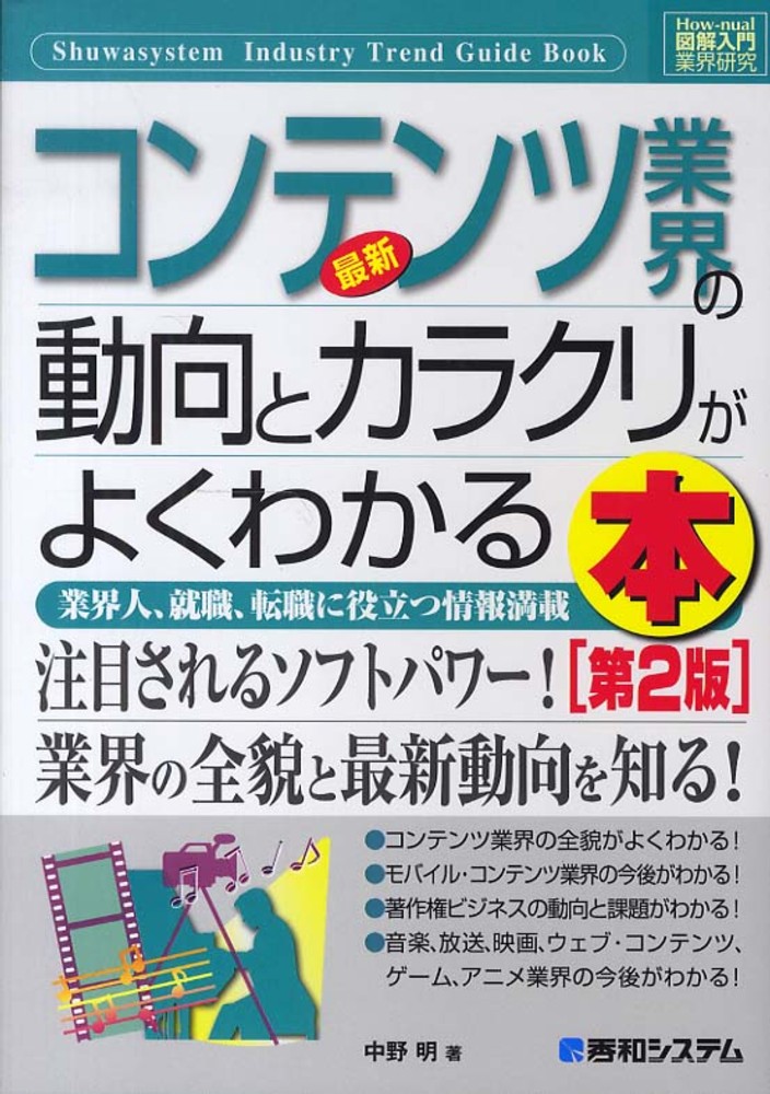 注目されるソフトパワー!業界の全貌と最新動向を知る。コンテンツ業界の全貌、モバイル・コンテンツ業界の今後、著作権ビジネスの動向と課題、音楽、放送、映画、ウェブ・コンテンツ、ゲーム、アニメ業界の今後がわかる。