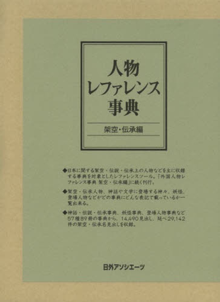 日本に関する架空・伝説・伝承上の人物などを主に収録する事典を対象としたレファレンスツール。架空・伝承人物、神話や文学に登場する神々、妖怪、登場人物などがどの事典にどんな表記で載っているか一覧出来る。神話・伝説・伝承事典、妖怪事典、登場人物事典など57種89冊の事典から、14,490見出し、延べ29,142件の架空・伝承名見出しを収録。「外国人物レファレンス事典架空・伝承編」に続く刊行。